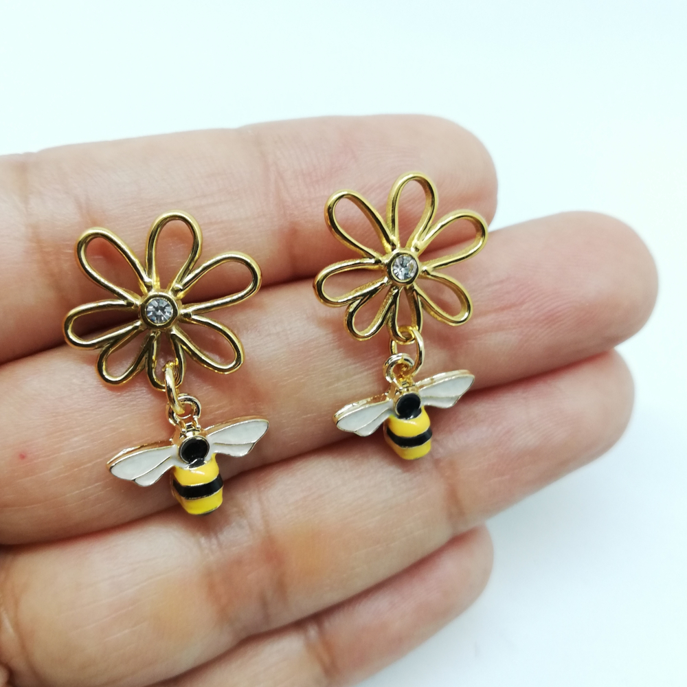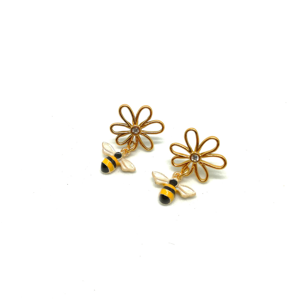 Pendientes base acero en forma de flor acabado brillo, colgante abejita metálica esmaltada cierre presión a juego